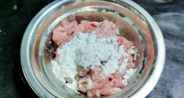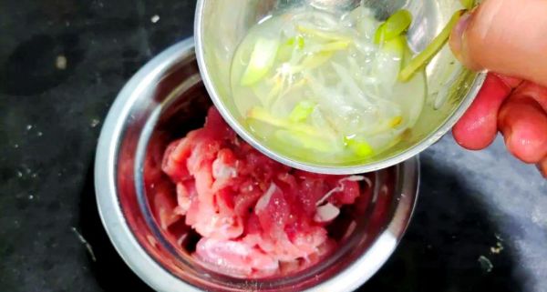取適量紅薯粉,加入剛燒開的熱水中攪拌均勻。務(wù)必使用紅薯粉,并確保用開水調(diào)制,以獲得更佳口感。將調(diào)制好的紅薯粉漿緩緩倒入肉片中,進行充分的抓拌,使每一片肉都均勻裹上粉漿。接著,再加入半湯匙的干紅薯粉,繼續(xù)抓拌均勻后備用。