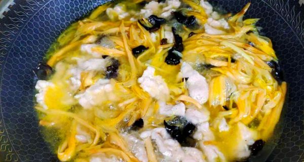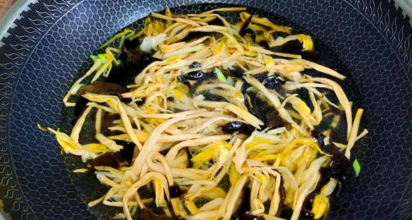 將鍋燒熱,倒入適量油,隨后加入切好的蔥姜進行爆香。接著,將黃花菜和木耳加入鍋中,翻炒幾下后,淋入足夠的開水,并加入適量的食鹽和雞精調(diào)味。然后,煮上2分鐘即可。