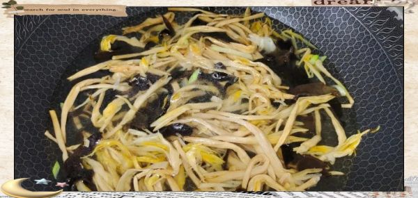 鍋中爆香蔥姜后,將處理好的主料和肉片下鍋,用小火慢煮提升湯汁鮮美,最后以香油增香。首先,將鍋燒熱,倒入適量油,隨后加入切好的蔥姜進(jìn)行爆香。接著,將黃花菜和木耳一同加入鍋中,翻炒數(shù)次后,倒入足夠量的開(kāi)水,并加入適量的食鹽和雞精進(jìn)行調(diào)味。然后,小火慢煮2分鐘,讓主料充分吸收湯汁。