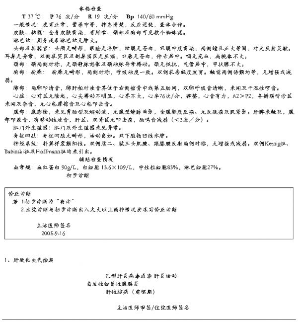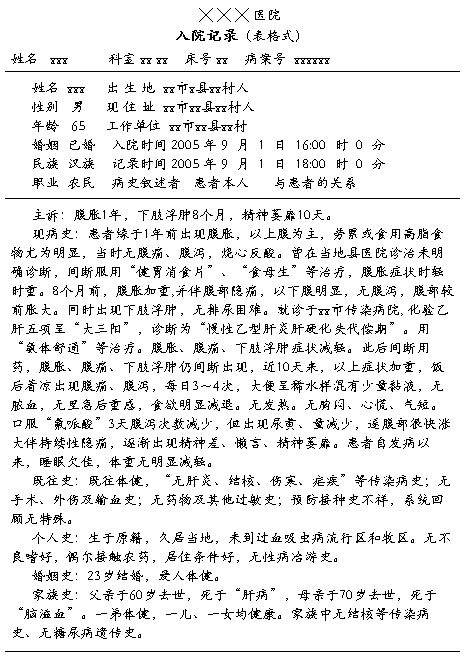 患者 xxx,男性,65歲,漢族,已婚,農(nóng)民,xx市xx縣xx村人。病史陳述者:患者本人。入院日期:20##-9-1 16:00;記錄日期:20##-9-1 18:00。