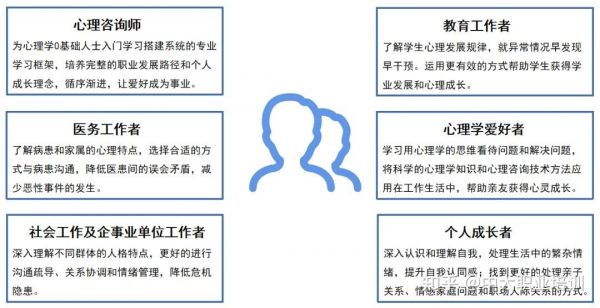 心理咨詢師證書適合以下人群報(bào)考,具體可根據(jù)個(gè)人職業(yè)規(guī)劃、興趣需求以及學(xué)習(xí)目標(biāo)進(jìn)行選擇: