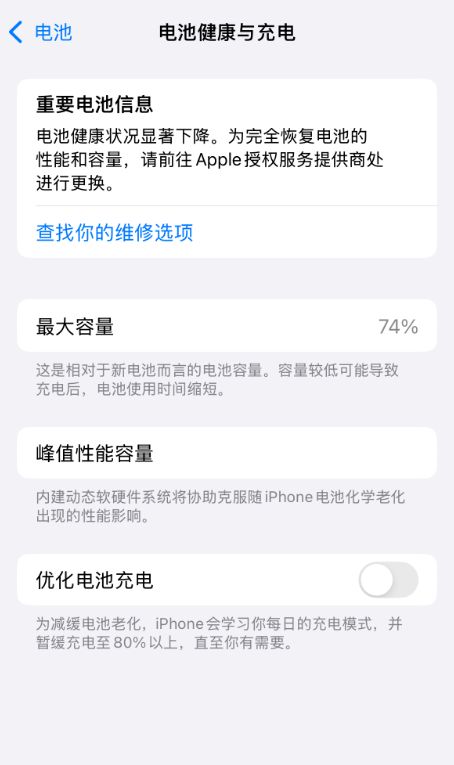 同時(shí),Apple也會(huì)在系統(tǒng)的 “電池健康與充電” 頁(yè)面顯示“服務(wù)”提示,提醒用戶當(dāng)前電池狀況已不佳。