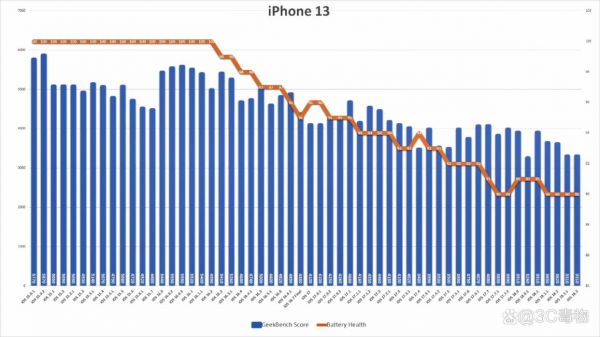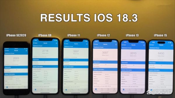 iPhoneSE2020的電池得分為2003分,iPhoneXR的電池得分為2718分,iPhone11的得分為3307分,iPhone12的電池得分為3557分,iPhone13的電池得分為3310分,iPhone15的電池得分為6450分。