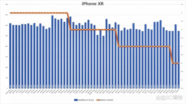 iOS18.2.1的iPhoneXR電池得分為3033分,iOS18.3版本的電池得分為2718分,電池健康度不變但是得分下降,所以iPhoneXR不建議升級。
