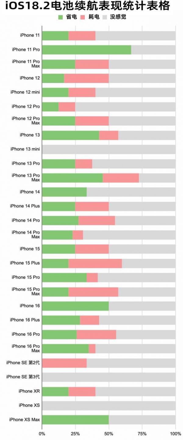 對于其他 iPhone 機型更新 iOS 18.2 電池續(xù)航力表現(xiàn)又如何呢?從網(wǎng)友體驗 匯報統(tǒng)計 顯示,多數(shù)新舊 iPhone 機型升級 iOS 18.2 后,都并沒有出現(xiàn)太嚴重耗電情況,甚至有網(wǎng)友還回饋,在更新 iOS 18.2 確實相對 iOS 18.1.1 省電和流暢多了!