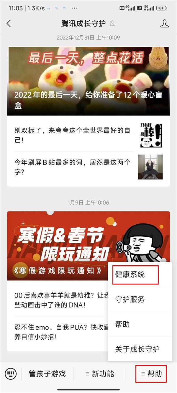 1、打開(kāi)微信,進(jìn)入騰訊成長(zhǎng)守護(hù)公眾號(hào),點(diǎn)擊幫助,再點(diǎn)擊健康系統(tǒng)。