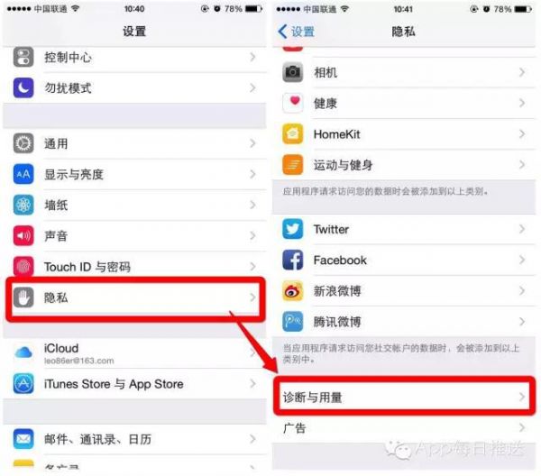 首先點(diǎn)選 設(shè)置->隱私->診斷與用量