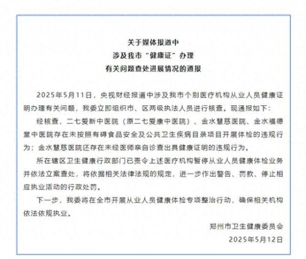 立案查處!鄭州通報(bào)“健康證”辦理亂象