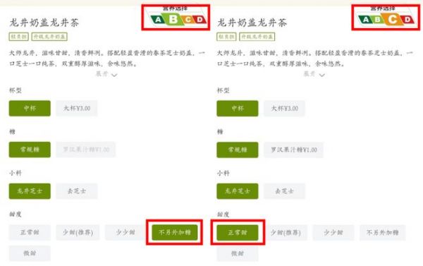 以奈雪的龍井奶蓋龍井茶為例,同樣一杯奶茶,如果你選擇了「常規(guī)糖」「正常甜」的版本,就會(huì)被分在C級(jí),而不另外加糖的版本,則被分在B級(jí)。