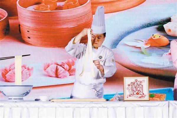 推介會(huì)現(xiàn)場(chǎng),三位烹飪大師為大家展示了陜味美食的制作技藝。西安飯莊面點(diǎn)大師汪峰展示了biangbiang面制作技藝,“德發(fā)長(zhǎng)餃子宴”非遺傳承人馬順莉大師制作了經(jīng)典餃子宴組合作品“荷塘月色”,烹飪大師李杰帶來精彩的面塑展演。三位大師通過一系列復(fù)雜且細(xì)致的動(dòng)作,給一團(tuán)面粉賦予了新的生命,將指尖上的非遺展示給現(xiàn)場(chǎng)觀眾,讓人們沉浸式品鑒美食,全方位感受老字號(hào)的傳承與發(fā)展。