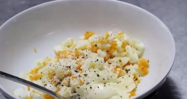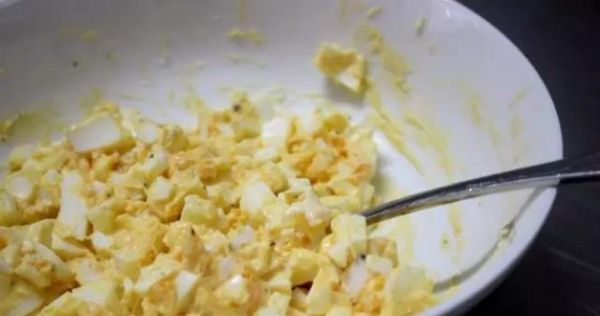 雞蛋2個煮熟,去殼切碎之后和大約1湯匙蛋黃醬拌勻,可以根據(jù)個人口味加入黑椒碎、芝士粉等等,中等大?。◣?5g上下)的室溫雞蛋,放進足量的沸水里不加蓋,9分半-10分鐘之后撈出用冷水冷卻,這樣煮好的雞蛋黃會比較嫩——蛋黃不會流動,但是也不像煮久了的蛋黃一樣有那種“粉粉的”感覺。