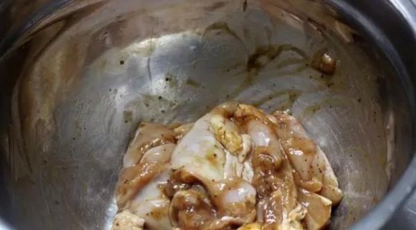 雞腿肉去骨(去骨后大約300g),加入約1.5湯匙亨氏黑胡椒醬、1.5茶匙番茄醬和1茶匙料酒抓勻,腌制2小時以上或者過夜。