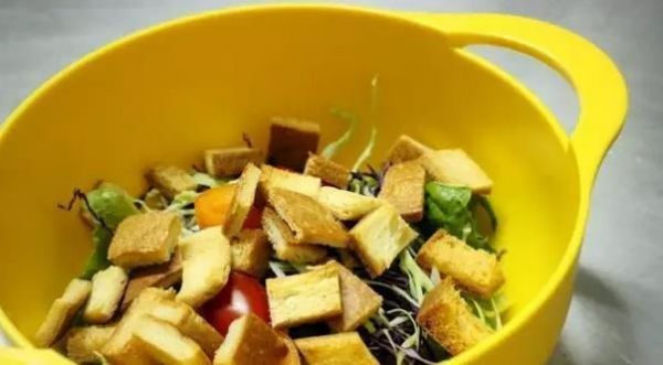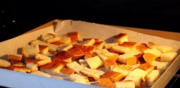 這東西我覺得挺香,挺喜歡吃的…也有很多人不愛吃它,覺得太硬而且沒啥味道。不過這么一碗都丟了也著實有些可惜,通過簡單的加工,可以讓它變身成一道小零嘴,同時也可以在沙拉里作為一道亮眼的配菜,面包邊切小塊,烤箱預熱好150度,開熱風之后放入,烤到酥脆就好,烤箱具體溫度、大小、面包邊的含水量都不相同,所以不給出詳細烘烤時間了。一般不會超過10分鐘,覺得差不多了就在旁邊看著,可以開門通過觸感(用筷子什么的)確認是不是已經(jīng)變酥脆了,小心點,別烤焦了。