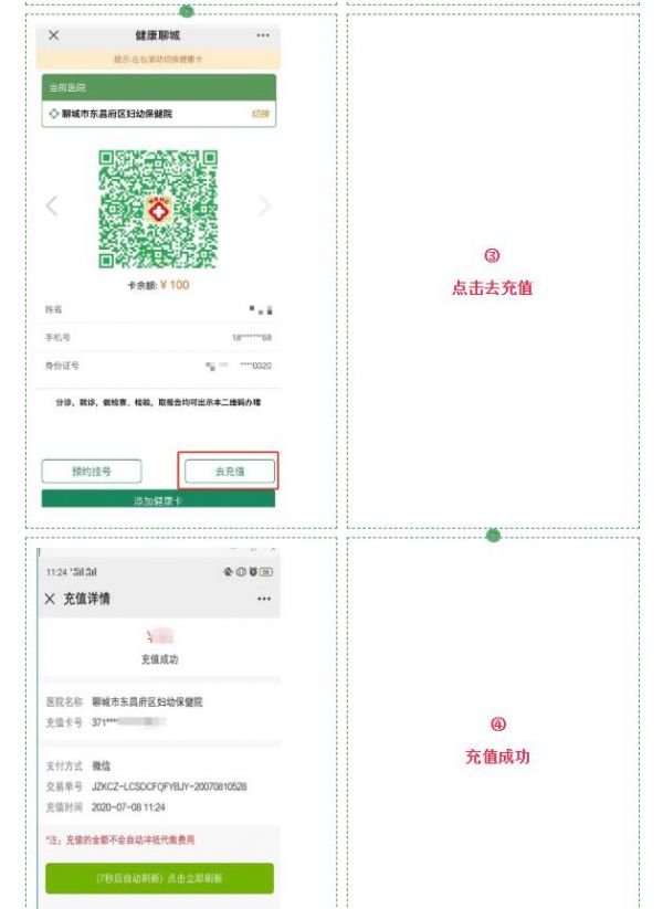 溫馨提示:健康聊城微信公眾號支持微信充值,使用支付寶、現(xiàn)金、銀行卡充值需到自助機或收費窗口進行繳費。