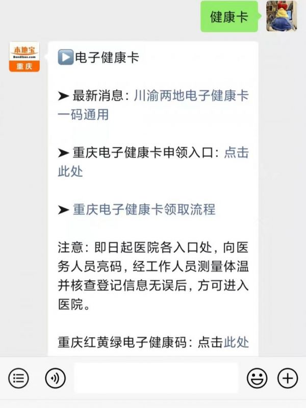 溫馨提示:微信搜索公眾號重慶本地寶,關(guān)注后在對話框回復(fù)【電子健康卡】可獲電子健康卡最新消息,電子健康卡申領(lǐng)入口、流程。