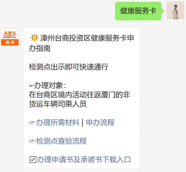 溫馨提示:微信搜索公眾號漳州本地寶,關(guān)注后在對話框發(fā)送【健康服務(wù)卡】可獲進出漳州臺商區(qū)往返廈門健康服務(wù)卡申辦材料、地點、流程、要求等內(nèi)容。