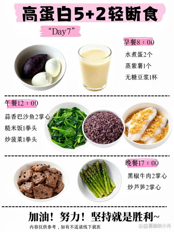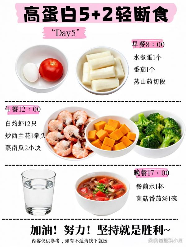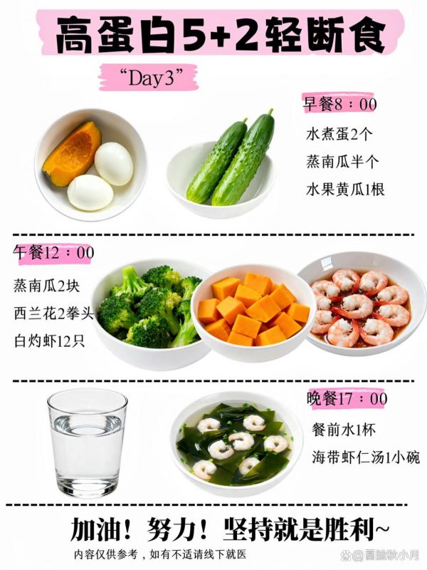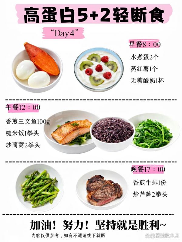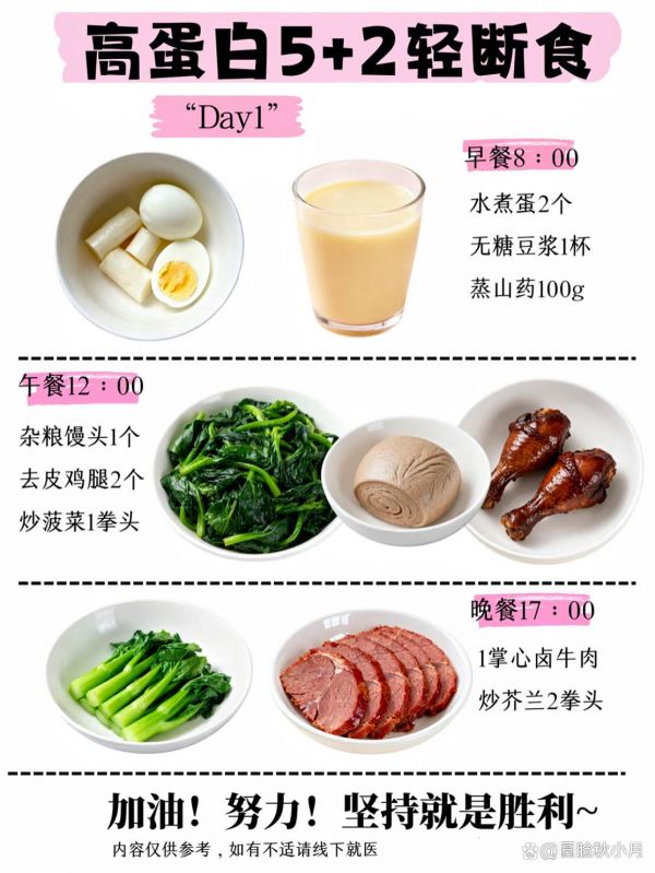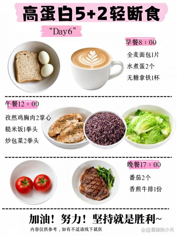 簡單來說,就是每周選擇不連續(xù)的2天作為“輕斷食日”,這2天女性攝入約500大卡,男性約600大卡,以高蛋白食物為主。其余5天正常進食,但要保證充足的蛋白質(zhì)攝入。這種方法既能給身體一個代謝重啟的機會,又不會因長期節(jié)食導致基礎代謝下降。