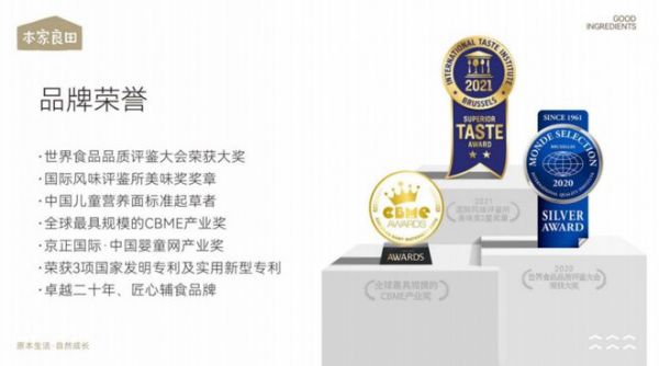 得益于長(zhǎng)期以來(lái)的品質(zhì)追求,本家良田旗下產(chǎn)品不僅斬獲第59屆世界食品品質(zhì)評(píng)鑒大會(huì)布魯塞爾大獎(jiǎng)、國(guó)際風(fēng)味評(píng)鑒所美味獎(jiǎng)等國(guó)際殊榮,證明了中國(guó)嬰童食品品牌的國(guó)際競(jìng)爭(zhēng)力;更先后拿下中嬰網(wǎng)嬰榜《中國(guó)孕嬰童最佳口碑獎(jiǎng)》、中國(guó)母嬰產(chǎn)業(yè)匠心輔食品牌等國(guó)內(nèi)權(quán)威榮譽(yù),形成國(guó)際國(guó)內(nèi)雙重認(rèn)可的品質(zhì)認(rèn)證體系,讓消費(fèi)者的信任有跡可循。