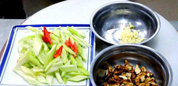 首先,將一把西芹的老筋撕去,接著把較寬的西芹從中間劃開(kāi),再切成菱形塊狀,盛入盤(pán)中。同時(shí),將半個(gè)紅椒也切成菱形塊狀,與西芹一同置于盤(pán)中。隨后,剝?nèi)ズ颂业耐鈿?,把果仁放入小盆中。最后,?zhǔn)備幾粒大蒜,逐個(gè)拍扁后切成蒜末,放入盆中待用。