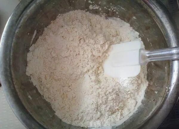 將牛奶或水緩緩倒入,持續(xù)翻拌,直至面粉中無干粉顆粒,呈現(xiàn)出面絮的質(zhì)地。