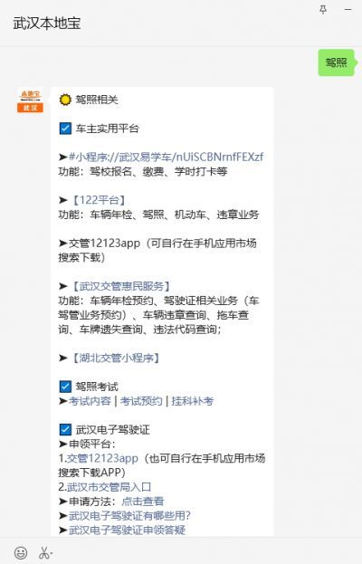 溫馨提示:微信搜索公眾號【武漢本地寶】,關(guān)注后在對話框回復(fù)【駕照】可獲武漢駕照網(wǎng)上辦事入口、還有駕考/期滿換證/延期換證/年審/學(xué)法減分/電子駕駛證申領(lǐng)等詳細(xì)指南。