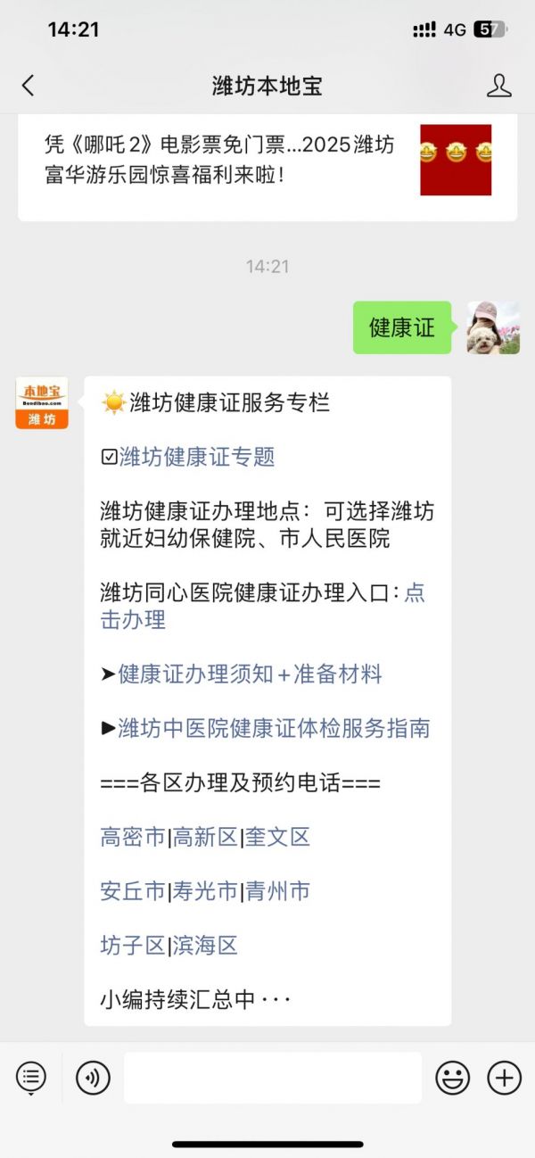 溫馨提示:微信搜索公眾號濰坊本地寶,關(guān)注后在對話框回復【健康證】可獲濰坊健康證線上申請入口、濰坊各區(qū)健康證辦理地點、辦理材料、辦理流程、辦理時限、辦理注意事項、咨詢電話等。
