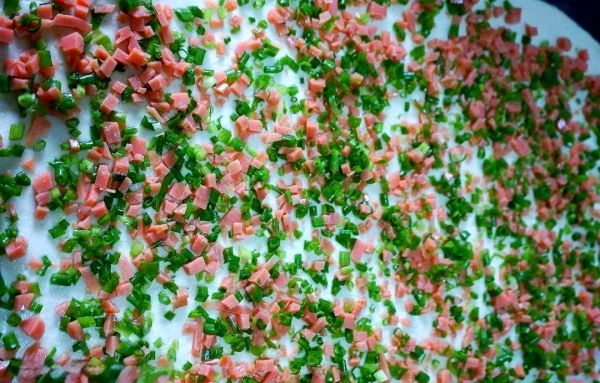 將面粉、白糖和酵母混合,逐漸加入適量的水,揉成稍軟的面團(tuán),并揉至表面光滑。將揉好的面團(tuán)置于案板上,撒上少許面粉以防粘連,將其按扁后,用搟面杖搟成一個(gè)長方形的大面片。接著,在面片上均勻地涂抹一層香油,再撒上適量的白胡椒粉和鹽。還可以根據(jù)個(gè)人口味添加椒鹽或孜然粉等調(diào)味料。通過傳統(tǒng)花卷的制作步驟,揭示其中的創(chuàng)意和技巧,使得讀者能夠更好地理解和實(shí)踐。將小香蔥切成碎末,放入碗中,加入少許小蘇打進(jìn)行攪拌,使其均勻混合。隨后,將處理好的香蔥末撒在面片上,再撒上一層切好的小火腿丁。