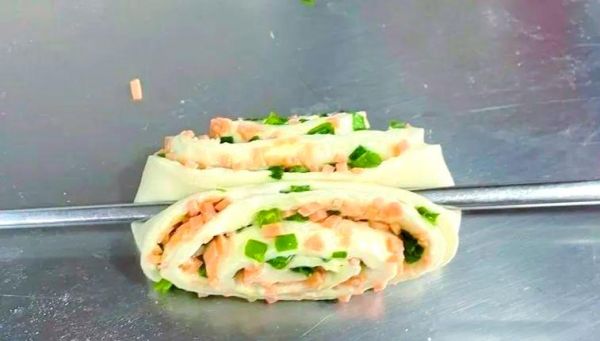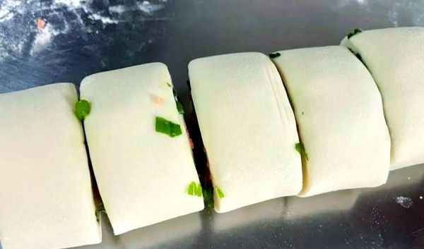 將面片從一側(cè)開始卷起,卷的過程中稍加緊實(shí),使香蔥和火腿丁能夠均勻地包裹在面片內(nèi)。將卷好的面片切成均勻且較窄的小段。接著,用一根筷子在每個(gè)小段的中間輕輕按壓,注意不要將面團(tuán)按斷。之后,雙手輕輕拉住面團(tuán)兩端,緩慢抻長,并在手指上輕輕繞一下,確保底部朝下后捏緊。將整好形的花卷放入鍋屜中,進(jìn)行醒發(fā),待其體積增大至1.5倍左右時(shí),便可開始燒水。水開后,將花卷放入鍋中開始蒸煮。根據(jù)花卷的大小,蒸煮時(shí)間控制在10-15分鐘之間。蒸煮完畢后,關(guān)火并繼續(xù)燜蓋2分鐘,即可出鍋享用美味的花卷啦!