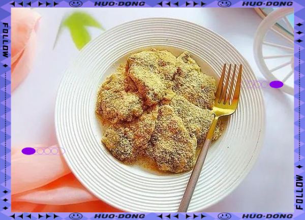 蒸好的糯米飯變成軟糯狀,加入熟黑芝麻和少許鹽進(jìn)行翻拌。用不粘鍋煎制至兩面呈現(xiàn)金黃色,最后裹上黃豆粉即可。