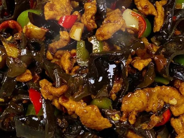 炒木耳:放入木耳塊,翻炒均勻,炒至木耳變軟,出汁。在炒制過程中,木耳會吸收調(diào)料的香味。