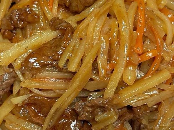 所需食材:胡蘿卜 1 根、土豆 1 個、豬里脊肉 150 克、大蔥 1 段、生姜 1 塊、大蒜 3 瓣、鹽適量、生抽 2 勺、老抽 1 勺、料酒 1 勺、淀粉適量、食用油適量、清水適量、蔥花適量。