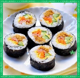 用料:米飯200克、海苔1張、胡蘿卜半根、黃瓜1/4根、雞蛋1個、火腿30克、肉松10克、食鹽1克、白醋6克、白糖3克。
