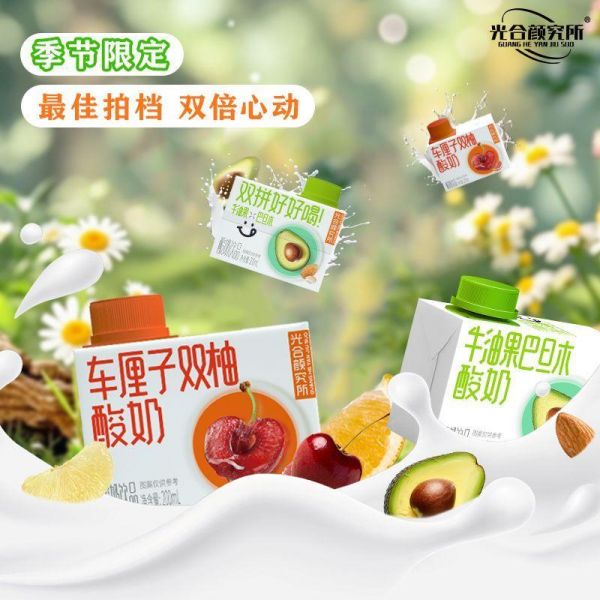 光合顏究所的雙重風(fēng)味酸奶則展現(xiàn)了另一種創(chuàng)意可能——牛油果巴旦木與車?yán)遄与p柚的奇妙組合,在200ml的小瓶子里碰撞出清新獨(dú)特的風(fēng)味層次。巴旦木的堅(jiān)果香與車?yán)遄拥墓鹣嗷ビ骋r,而雙柚的微酸則完美平衡了整體口感
