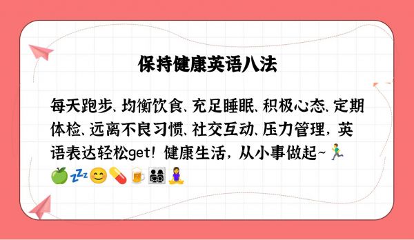 通過這些方法,你可以在英語中表達出如何保持健康的生活態(tài)度和行為。記住,保持健康是一個綜合性的過程,需要我們在日常生活中不斷實踐和堅持。