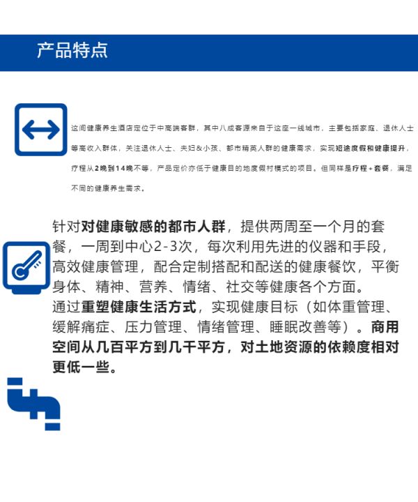 健康管理中心模式對(duì)資源的依賴度較弱,投資規(guī)模較小、開發(fā)周期較短,進(jìn)入的專業(yè)門檻和落地運(yùn)營(yíng)的難度較小??驮赐怀霰镜靥厣?,重點(diǎn)吸引城市健康敏感群體,產(chǎn)品服務(wù)定位不需要太高端。