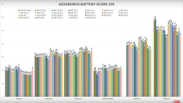 iAppleBytes 測(cè)試蘋果部分機(jī)型在不同系統(tǒng)版本的電池續(xù)航分?jǐn)?shù)整理如下: