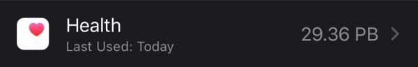 健康應(yīng)用除了不正常的耗電,還錯(cuò)誤地顯示它所占用的存儲空間。如下圖所示,一部 64GB 的 iPhone,健康應(yīng)用竟然占用了 9.11PB 的空間,另一位用戶甚至顯示 29.36PB (29360000GB),難道升級 iOS 14 還能神奇地?cái)U(kuò)容?