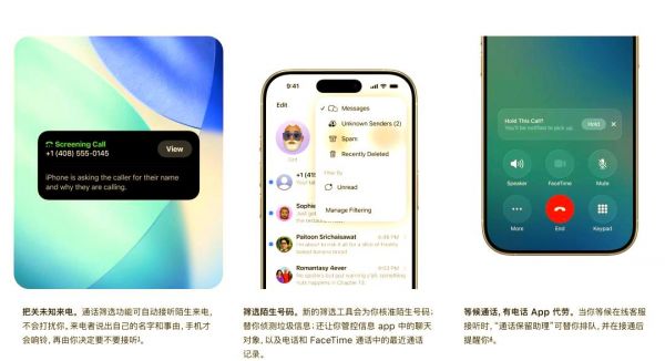 相機(jī)、照片、Safari以及電話等核心應(yīng)用也得到了顯著改進(jìn)。比如,通話篩選功能可對(duì)未知來(lái)電進(jìn)行語(yǔ)音驗(yàn)證,而“通話保留助理”則能代用戶等待,直至在線客服接通。信息應(yīng)用同樣有所升級(jí),支持篩選未知號(hào)碼、發(fā)起群組投票,并允許為對(duì)話添加個(gè)性化背景。