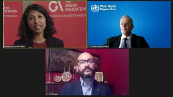 Top row: Adrita Bhattacharya-Craven, Director Health & Ageing, The Geneva Association (Moderator); Gaudenz Silberschmidt, Director for Health and Multilateral Partnerships, External Relations, World Health Organization. Bottom row: Aly Shalaby, Deputy Chief Medical Director, AXA OneHealth.