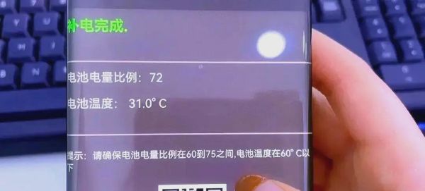 緊接著,我們找到并點(diǎn)擊屏幕上的“補(bǔ)電”選項(xiàng),即可完成補(bǔ)電。此時(shí),手機(jī)會(huì)顯示一條提示信息,提醒我們確保電池電量在60%~75%之間,且電池溫度不超過(guò)60度。我們可以看到,當(dāng)前我的電池電量為72%,電池溫度為31度,均符合要求。若您的電池電量低于60%,則需注意調(diào)整,以確保補(bǔ)電過(guò)程順利進(jìn)行。