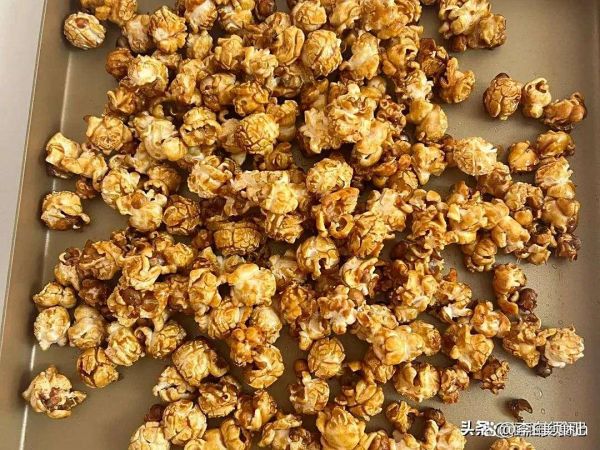 干鍋炒玉米至爆開(kāi),另熬化黃油和糖,淋上拌勻。