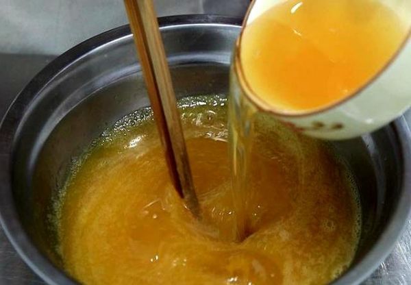 待白糖完全融化,便緩緩注入100克融化的黃油,一邊注入,一邊用筷子輕柔地攪動,確保它們完美融合,不留一絲痕跡。