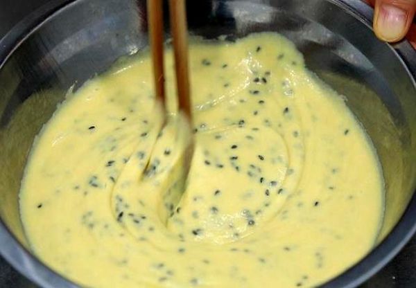 攪打成柔滑的糊狀,再撒入一把飽滿的黑芝麻,為這金色的卷兒增添一抹跳躍的色彩和迷人的香氣,再次攪勻,靜待時機。