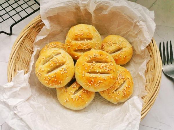 6、用刀片在餅的表面劃上兩道口子,以便烤的過程中方便透氣,刷上一層蛋黃液、撒上一些白芝麻。
