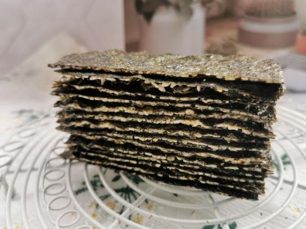6、烤箱預熱100℃,將壓好的海苔放入烤箱,烤20分鐘左右,放涼之后就是酥脆的了,如果涼透之后還是軟的,那么送入烤箱繼續(xù)烤幾分鐘。