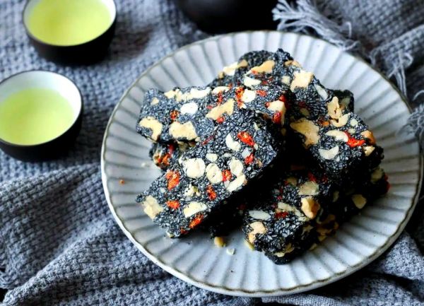 首先,在鍋中加熱水、椰糖、山茶油和麥芽糖,攪拌直至糖漿濃稠。待溫度適中后,加入黑芝麻粉、核桃和枸杞,攪拌均勻。之后,將混合物倒入容器中壓平,趁熱切成薄片,就是誘人的芝麻糖。