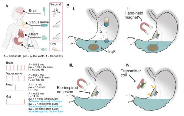 到達(dá)目標(biāo)位置后,IngRI利用仿生水凝膠的粘附作用,牢固地附著在胃粘膜上,確保設(shè)備的穩(wěn)定性和適形電極與組織的有效接觸。通過近場(chǎng)感應(yīng)耦合,IngRI能夠提供可編程的電脈沖,用于刺激胃腸道中具有電興奮性的細(xì)胞,以達(dá)到治療的目的。這種設(shè)備的設(shè)計(jì)克服了傳統(tǒng)可攝入電刺激設(shè)備的一些限制,如電極與組織接觸不良和電池壽命有限,為胃腸道疾病的治療提供了新的可能性。