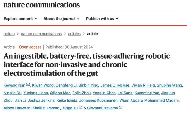 近日,浙江大學(xué)南科望研究員聯(lián)合香港城市大學(xué)于欣格教授和麻省理工學(xué)院Giovanni Traverso教授,在 Nature Communications 期刊發(fā)表了題為:An ingestible, battery-free, tissue-adhering robotic interface for non-invasive and chronic electrostimulation of the gut 的研究論文。