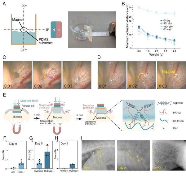 接下來,研究團(tuán)隊(duì)通過使用外部手持式磁鐵模擬IngRI體內(nèi)導(dǎo)航,進(jìn)行了體外裝置的實(shí)驗(yàn),并展示了相關(guān)的光學(xué)圖像。實(shí)驗(yàn)結(jié)果表明,IngRI在不同方向和濕度條件下的最小驅(qū)動(dòng)距離具有顯著差異,這些數(shù)據(jù)對(duì)于優(yōu)化其導(dǎo)航性能至關(guān)重要。此外,IngRI在體內(nèi)成功展示了其卓越的導(dǎo)航和翻轉(zhuǎn)能力。為了增強(qiáng)IngRI在胃內(nèi)的停留時(shí)間,研究團(tuán)隊(duì)設(shè)計(jì)了一種仿生水凝膠粘合劑。該粘合劑通過軟硅膠盤和凍干水凝膠的雙層結(jié)構(gòu),提供了物理和化學(xué)粘附的結(jié)合,能夠有效應(yīng)對(duì)胃內(nèi)苛刻的環(huán)境。實(shí)驗(yàn)數(shù)據(jù)顯示,加入軟硅膠盤或凍干水凝膠后,IngRI的平均剝離力在第0天顯著增加,且在第7天使用仿生水凝膠粘合劑后,剝離力仍然保持較高水平。進(jìn)一步的研究通過射線照片跟蹤了帶有仿生水凝膠粘合劑的IngRI在豬胃中的停留情況(圖3)。結(jié)果顯示,在攝入48小時(shí)后,七分之五的裝置完好無損,證明了其在體內(nèi)的穩(wěn)定性和持久性。