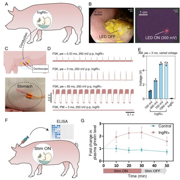 最后,研究團(tuán)隊(duì)使用成年豬模型進(jìn)行了活體實(shí)驗(yàn),通過內(nèi)窺鏡圖像展示了IngRI在腸道內(nèi)對(duì)LED設(shè)備進(jìn)行無線供電的能力(圖5)。這種無線供電技術(shù)證明了IngRI在真實(shí)生物環(huán)境中的實(shí)用性和可靠性。為了進(jìn)一步驗(yàn)證IngRI的功能,團(tuán)隊(duì)測(cè)量了其傳遞的傳導(dǎo)信號(hào)。實(shí)驗(yàn)中,針電極被放置在豬的腹部,檢測(cè)并記錄了相應(yīng)的波形。結(jié)果顯示,皮下針電極記錄的FSK調(diào)制下的不同脈沖寬度波形清晰可見,而對(duì)照實(shí)驗(yàn)表明無線傳輸不會(huì)干擾皮下記錄。此外,研究團(tuán)隊(duì)還探討了在AM調(diào)制方案下使用不同輸入電壓時(shí)皮下記錄的平均輸出電壓。實(shí)驗(yàn)結(jié)果表明,不同輸入電壓下的輸出電壓具有顯著差異,為IngRI的實(shí)際應(yīng)用提供了重要數(shù)據(jù)支持。研究團(tuán)隊(duì)還測(cè)量了使用IngRI刺激的成年豬血漿胃生長(zhǎng)激素釋放肽水平,并展示了血漿胃生長(zhǎng)激素釋放肽水平隨時(shí)間變化的平均倍數(shù)變化。